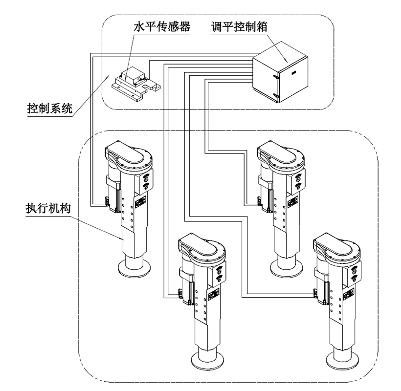 汽车自动调平系统为机电一体化产品,由控制系统和执行机构两部分组成,本装置采取电动形式,能有效支撑车辆自动升降,使车辆自动精准调平,调平精度≤5'。并使车辆停泊稳定、安全、可靠。